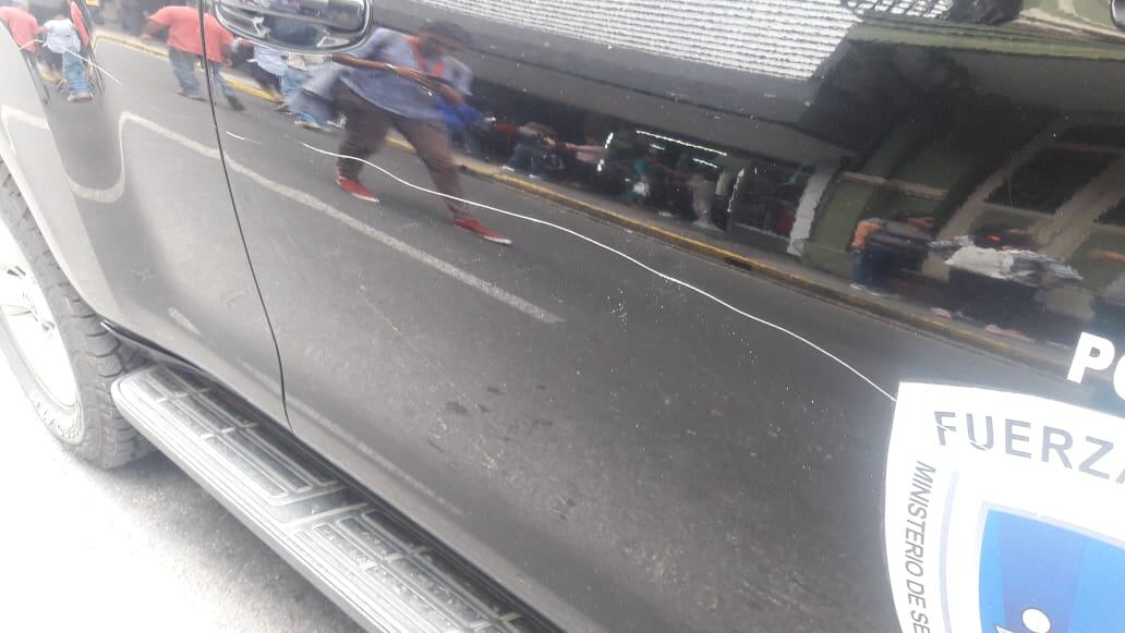 Finalmente el presidente tuvo que recorrer unos 75 metros por la plaza de la Cultura para llegar al carro que lo transportaría. En ese momento un molote se le fue encima con una lluvia de madrazos.