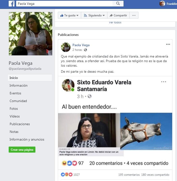 La publicación generó de inmediato reacciones contrarias y Varela la eliminó, pero Vega publicó luego en su perfil de Face: “Que mal ejemplo de cristiandad da don Sixto Varela. Jamás me atrevería yo, siendo atea, a ofender así. Prueba de que la religión no es la que da los valores. De mi parte yo le deseo mucha paz”, dijo.