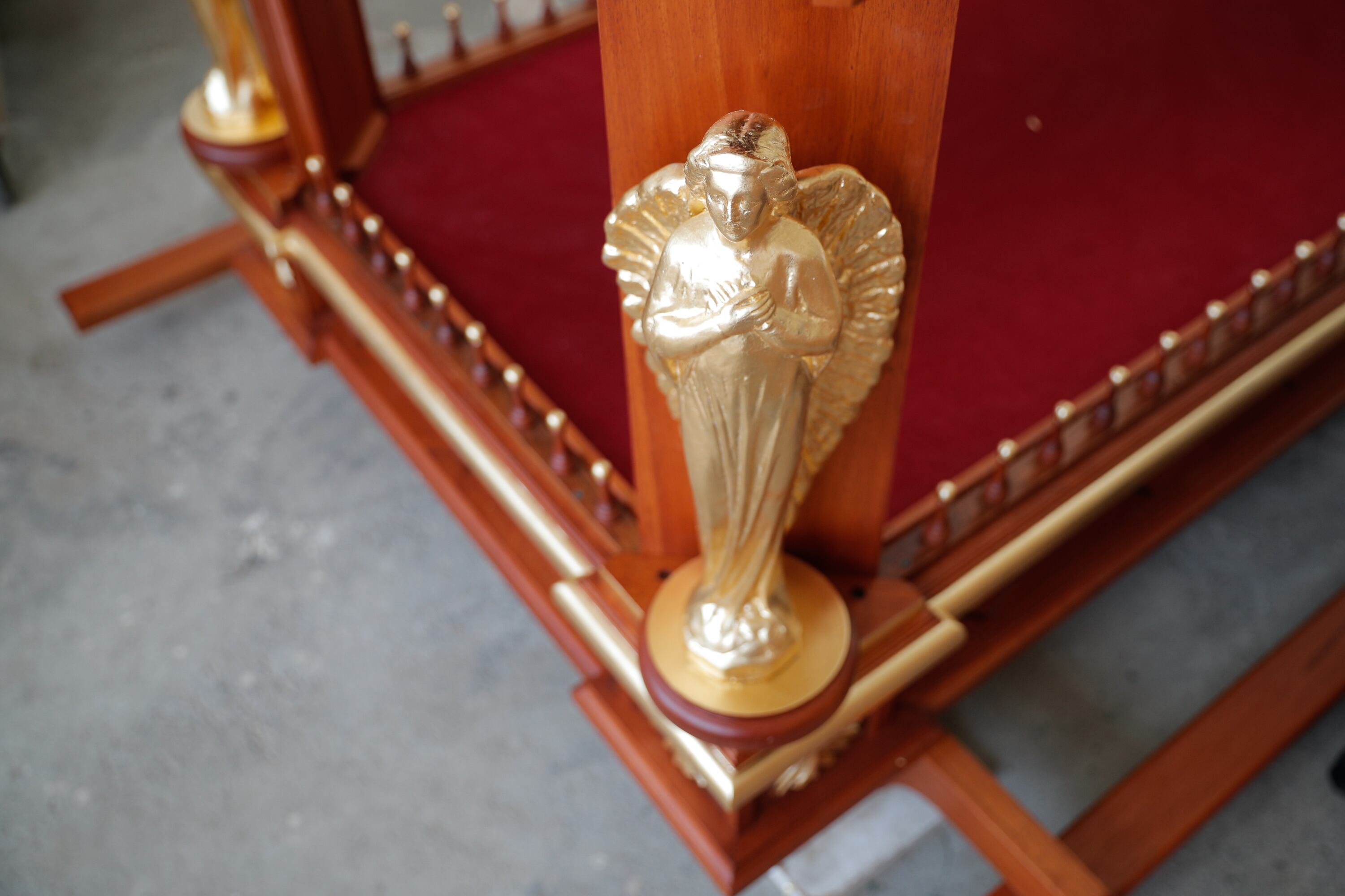 Cuando terminó la estructura en madera, la trasladó a la casa de otro experto en la materia: el escultor y restaurador Bernardo Ramírez Redondo, quien junto a su hija Jéssika Ramírez se encargó de fabricar, en fibra de vidrio, los cuatro angelitos que van en cada una de las esquinas del nuevo sepulcro.