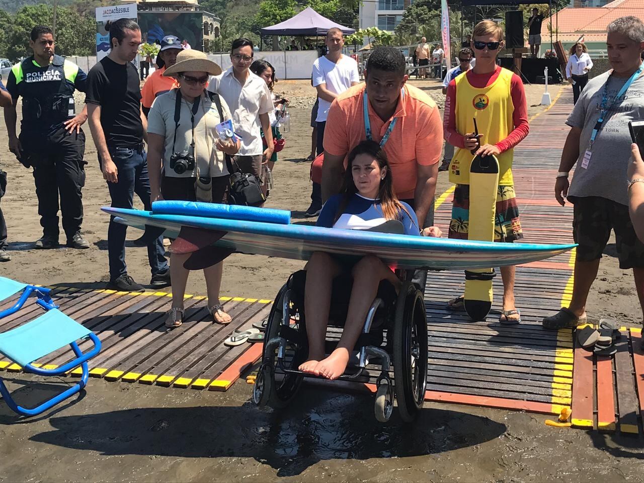 La surfista Natalia Vindas fue una de las elegidas para inaugurar una nueva pasarela en playa Jacó que le dará acceso al mar a las personas en sillas de ruedas o con problemas de movilidad.