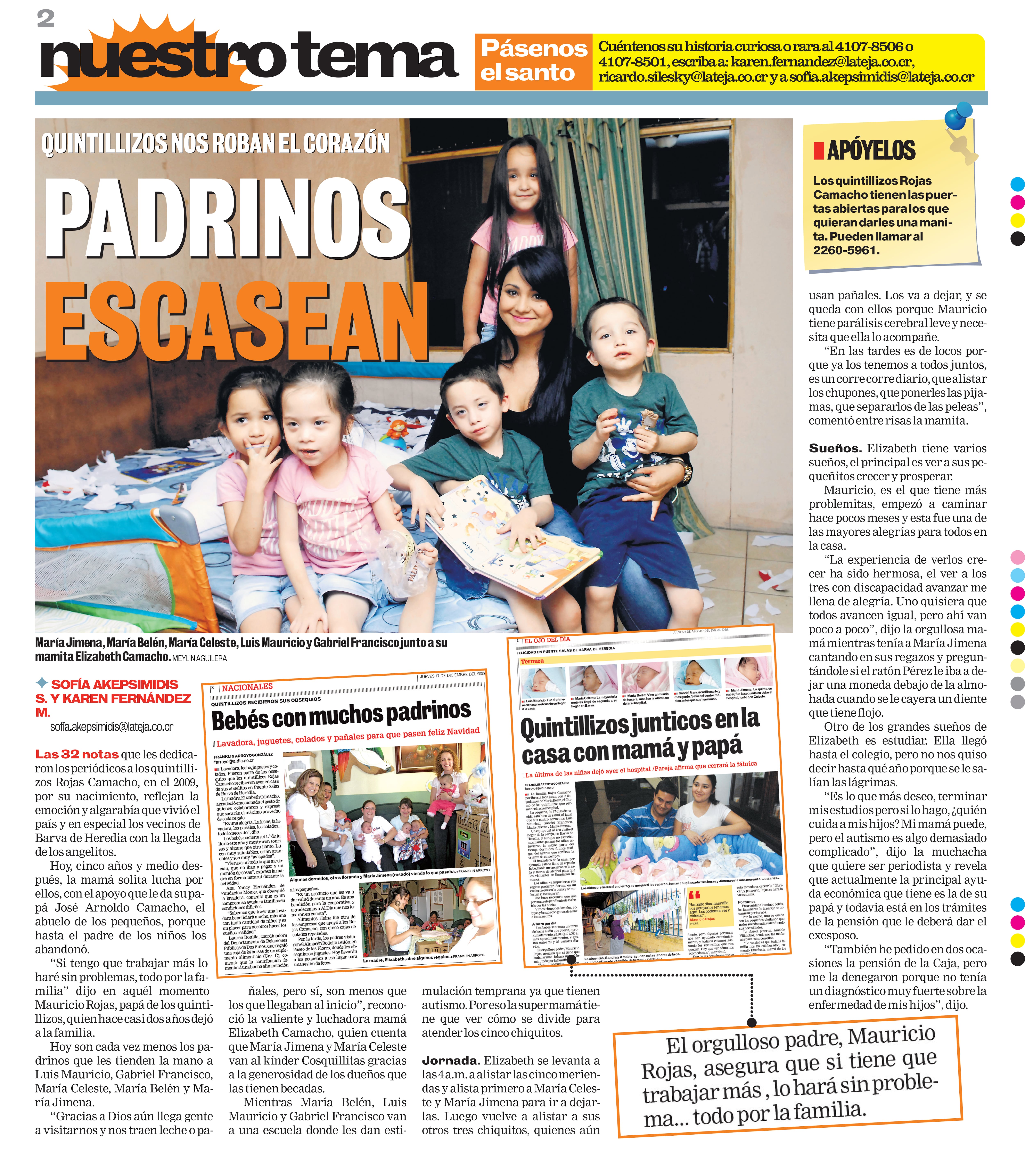Los menores que se robaron el corazón de los costarricenses en el 2009 ya están cursando el cuarto grado, Jimena y María Celeste en la escuela de Puente Salas, mientras que sus hermanos Belén, Gabriel y Mauricio acuden a la escuela de enseñanza especial de Heredia, por su condición de autismo.
