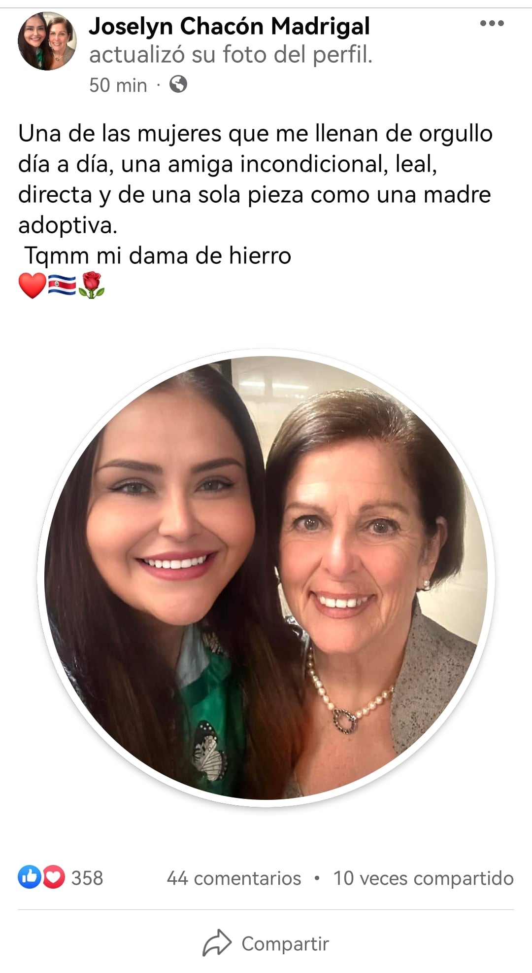 La cariñosa publicación se da solo un día después de que Cisneros fuera criticada duramente por varios legisladores, luego de que Ariel Robles, diputado del Frente Amplio, dejó en evidencia que ella habría estado omitiendo parte de un documento del Tribunal Supremo de Elecciones (TSE), por supuesta conveniencia.