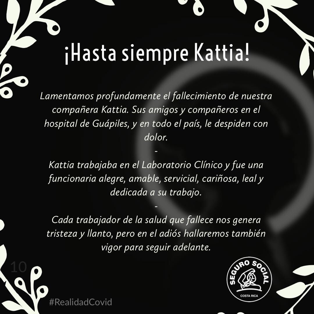 “¡Hasta siempre, Kattia! Lamentamos profundamente el fallecimiento de nuestra compañera Kattia Loría. Sus amigos y compañeros en el hospital de Guápiles, y en todo el país, le despiden con dolor”, dice una imagen publicada en redes sociales..