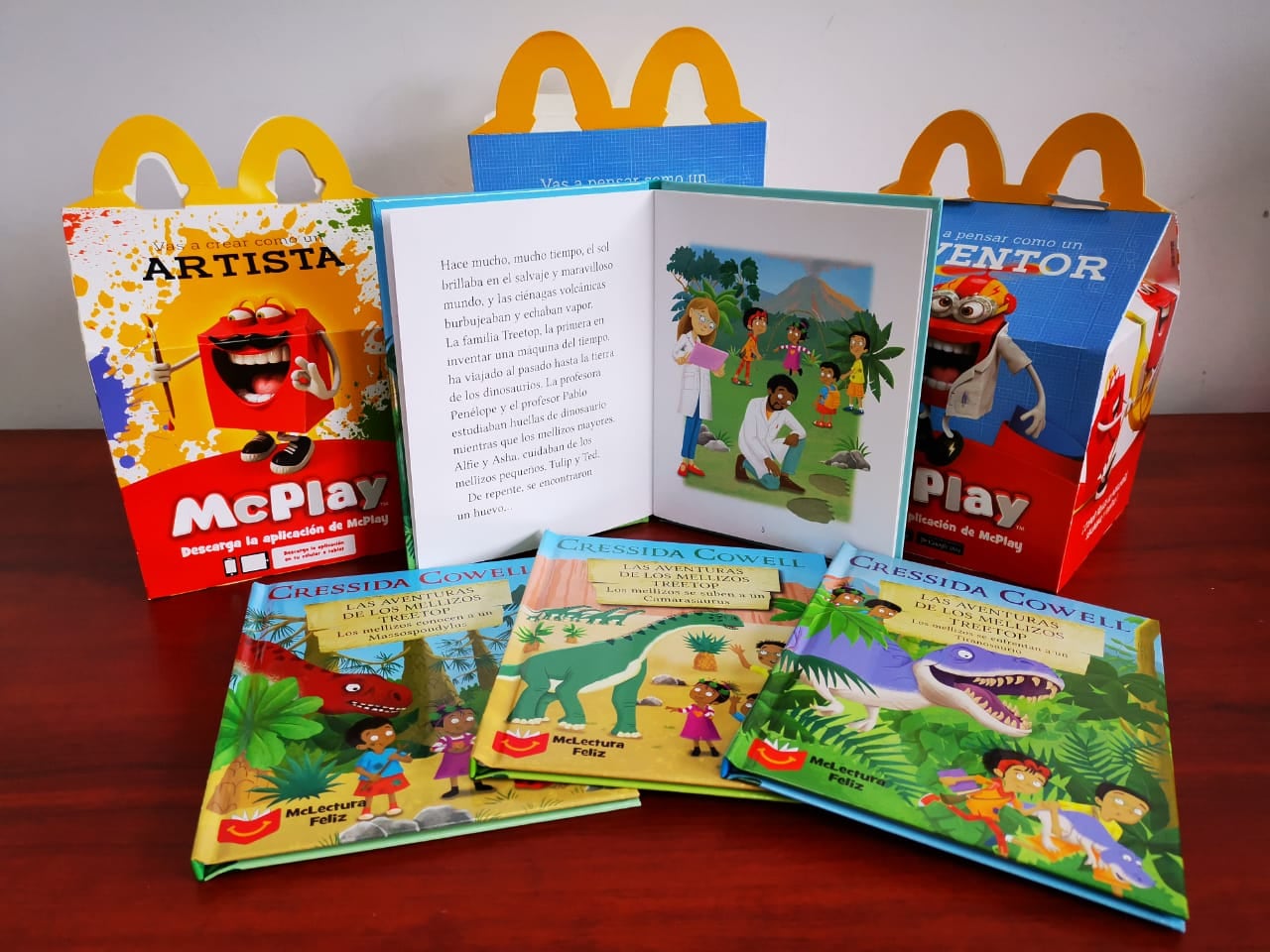 Para este año, McDonald’s se asoció con Cressida Cowell, autora mundialmente conocida por su bestseller Cómo entrenar a tu dragón, quien escribió 12 libros exclusivos. Las Aventuras de los Mellizos Treetop cuentan las distintas aventuras que viven los Mellizos Treetop, Alfie, Asha, Tulip y Ted que, gracias a una máquina del tiempo construida por sus padres y los profesores Penelope y Pablo, se vuelven la primera familia en viajar a través del tiempo a estudiar la época de los dinosaurios.