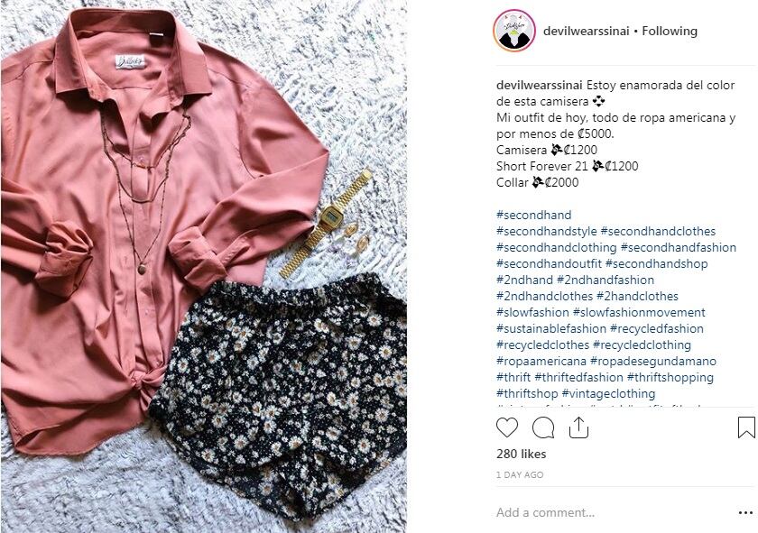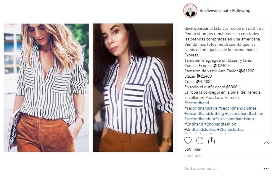 Tanto fue el pegue que esta sancarleña, quien ahora vive en Heredia, que se abrió una cuenta de Instagram llamada devilwearssinai (https://www.instagram.com/devilwearssinai/?hl=en), en la que publica conjuntos de ropa que baja de aplicaciones como Pinterest y las copia tal cual con prendas que compra en americanas.