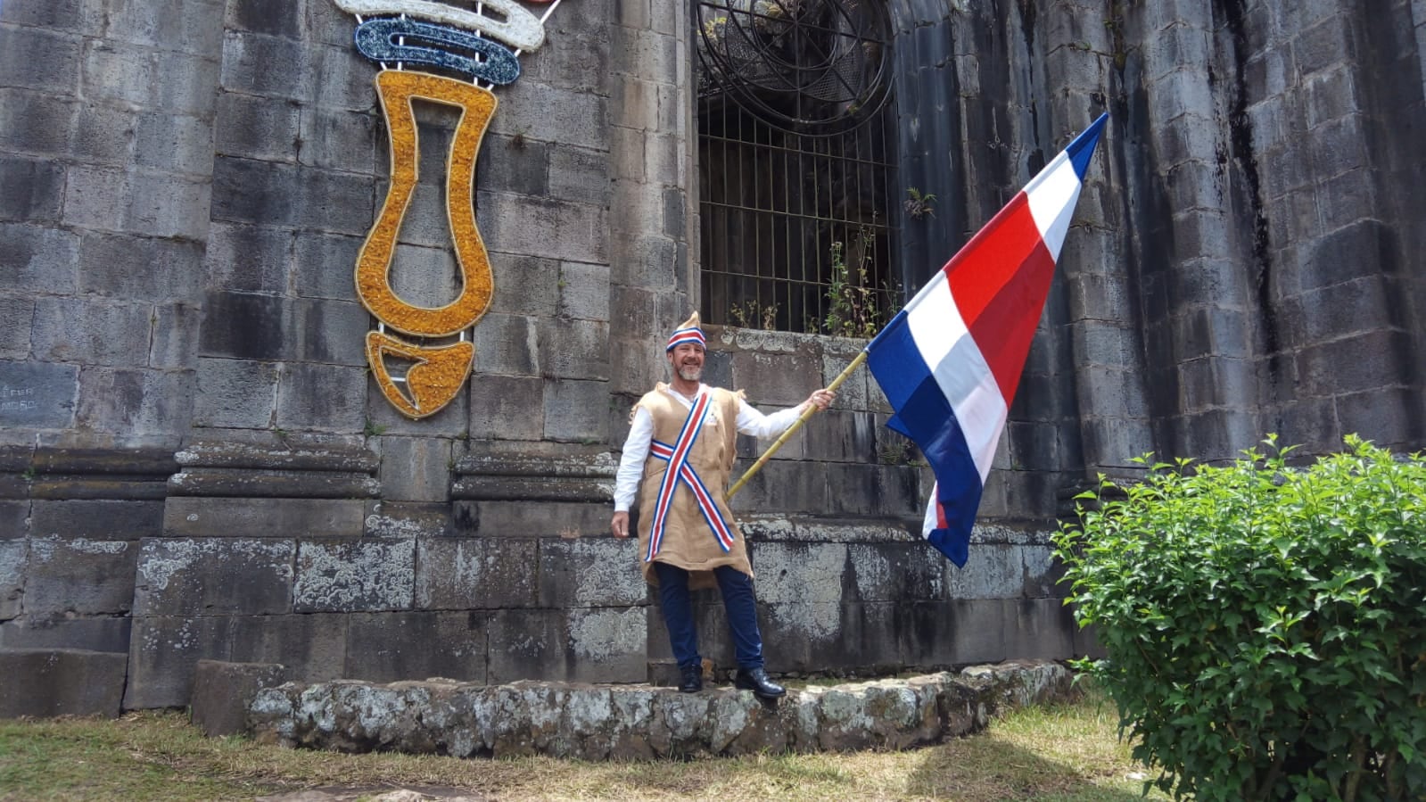 Enfundado en un saco de gangoche, de aquellos que por décadas eran utilizados por los cogedores de café, el cartaginés Marco Coto Calvo, celebró solitariamente la independencia, portando una bandera y subiendo a uno de los pretiles de las ruinas de Cartago.