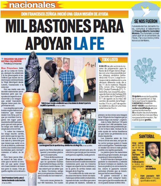 El bastón que le regaló el señor desconocido es ni más ni menos uno de los 400 que hizo don Francisco Zúñiga para regalar. Él es vecino de La Lima de Cartago y se los presentamos el pasado 7 de julio en una nota en la cual él mismo explicó que el sacrificio de los peregrinos lo conmueve demasiado y por eso les hizo esos bastoncitos gratis, para que se ayudaran.
