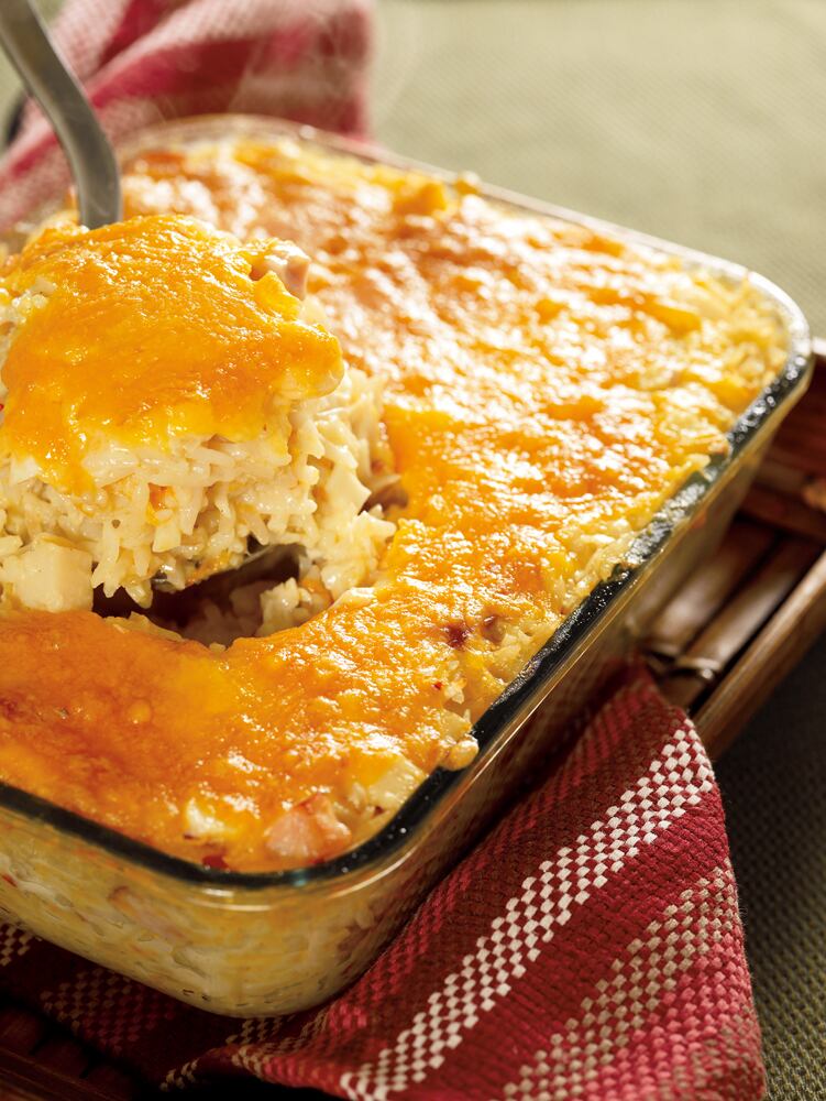 Preparación: en un recipiente se coloca una capa de arroz, una de palmito y otra de queso. Se baña con la crema dulce y se hornea. Introducir un cuchillo para ver cuando esté listo.