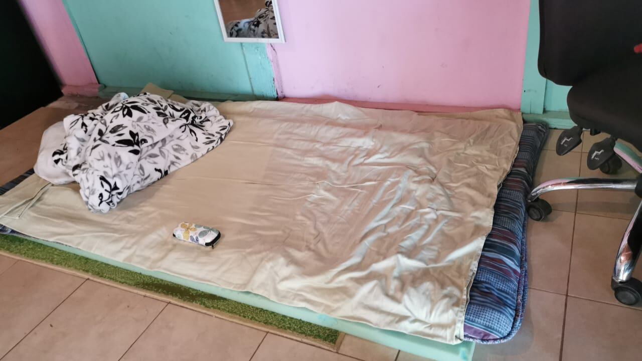 Mientras haga buen tiempo, la educadora transforma el aula en su dormitorio colocando en el suelo una alfombra y una colchoneta; cuando llueve la cosa cambia, como hay muchas probabilidades de que se meta el agua, debe acomodarse sobre el escritorio.