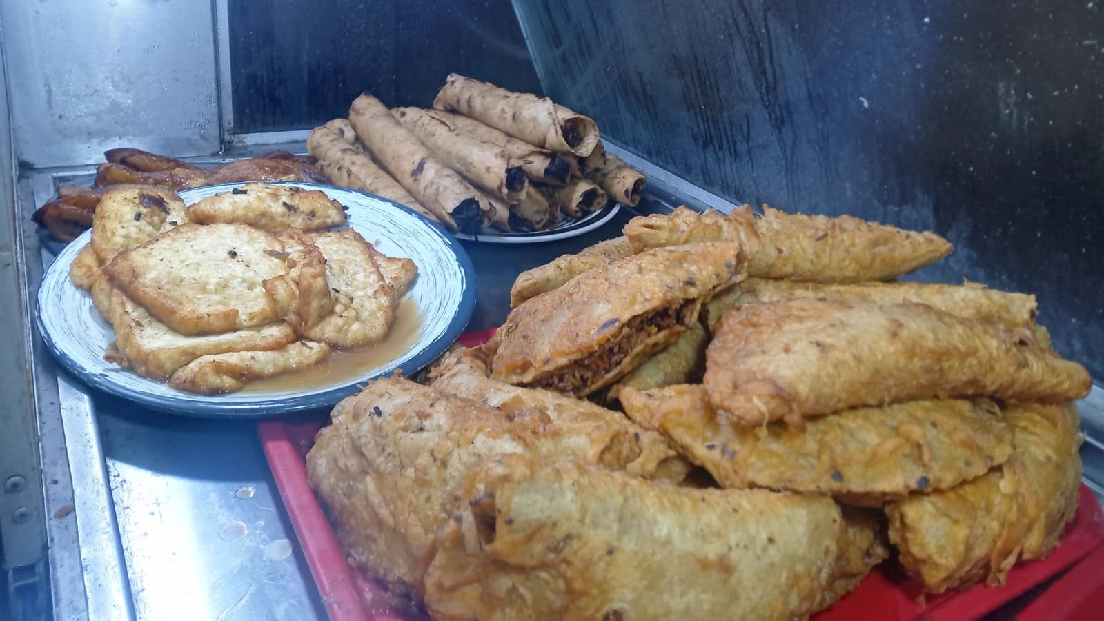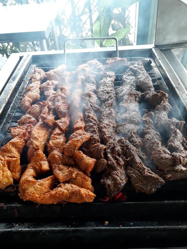 Ellas acondicionaron la cochera de la casa en la que viven para atender a la gente, pusieron seis mesas para que los clientes que lo deseen pueden comer ahí mismo, la parrilla está debajo de un techo ahí mismo y también tienen unas urnas donde están las enchiladas, papas rellenas, plátano maduro con queso y otras delicias.