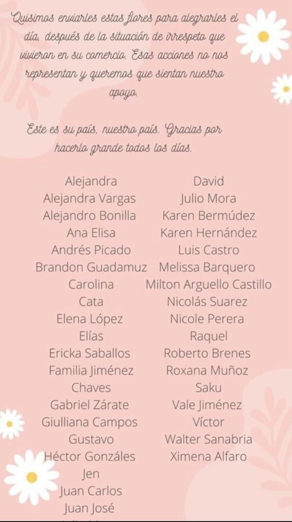 “Buscamos un comercio cercano en Heredia para que mandara las flores y el mensaje. Nos pareció mejor así y no aparecer nosotras en ninguna foto”, dijo.
