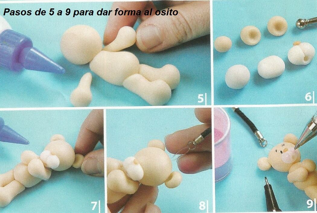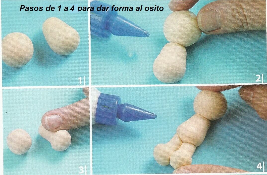 El cuerpo, las patas y las manos se forman haciendo una bolita y dándoles forma de pera, a las patas debe dejarle más ancho la parte de abajo. (Ver pasos de 1 a 4). La cabeza se modela en forma de bola, ya con las piezas listas puede formar el cuerpo, recuerde que cada pieza se pega con la goma blanca.