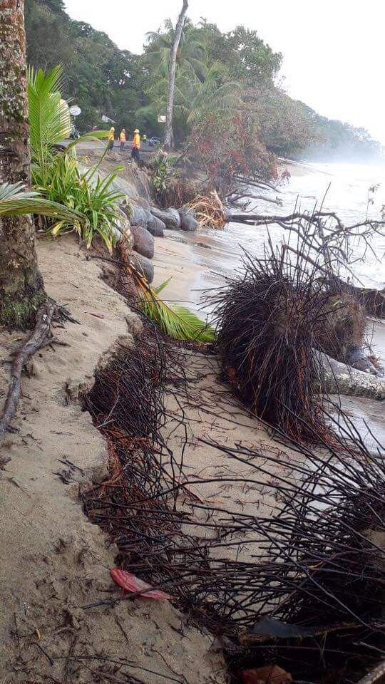 Un fenómeno igual ocurre en las playas del parque nacional Cahuita, donde el mar se ha comido 20 metros del parque. En el centro de Limón también ocurre pero de manera más constantes.