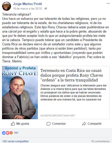 Protti, coordinador de sismología del Observatorio Vulcanológico y Sismológico de la Universidad Nacional (Ovsicori), se molestó por una publicación de hace seis años de la página Acontecer Cristiano según la cual Chaves defiende que el terremoto de Nicoya del 2012 no causó estragos debido a que él le "ordenó" a la tierra "tranquilidad".