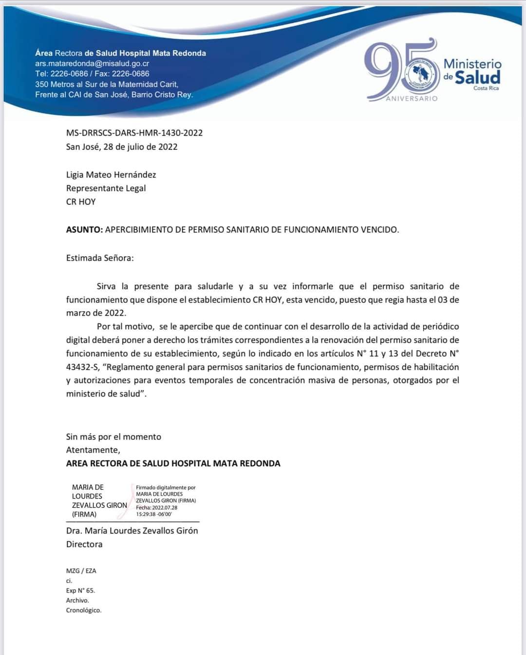 El Ministerio de Salud, por medio del Área Rectora de Salud de Mata Redonda, apercibió hoy al medio digital CRHoy asegurando que tiene el permiso sanitario vencido.