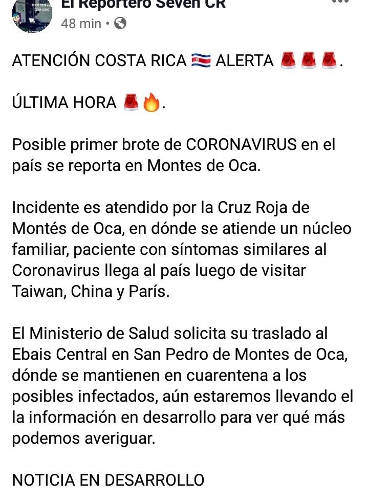 Además, este mismo jueves se descartó un posible brote del virus que se reportó en Montes de Oca. En medios no oficiales se comunicó que se atendió una familia con síntomas similares a los del coronavirus y que llegó al país luego de visitar Taiwán, China y París.