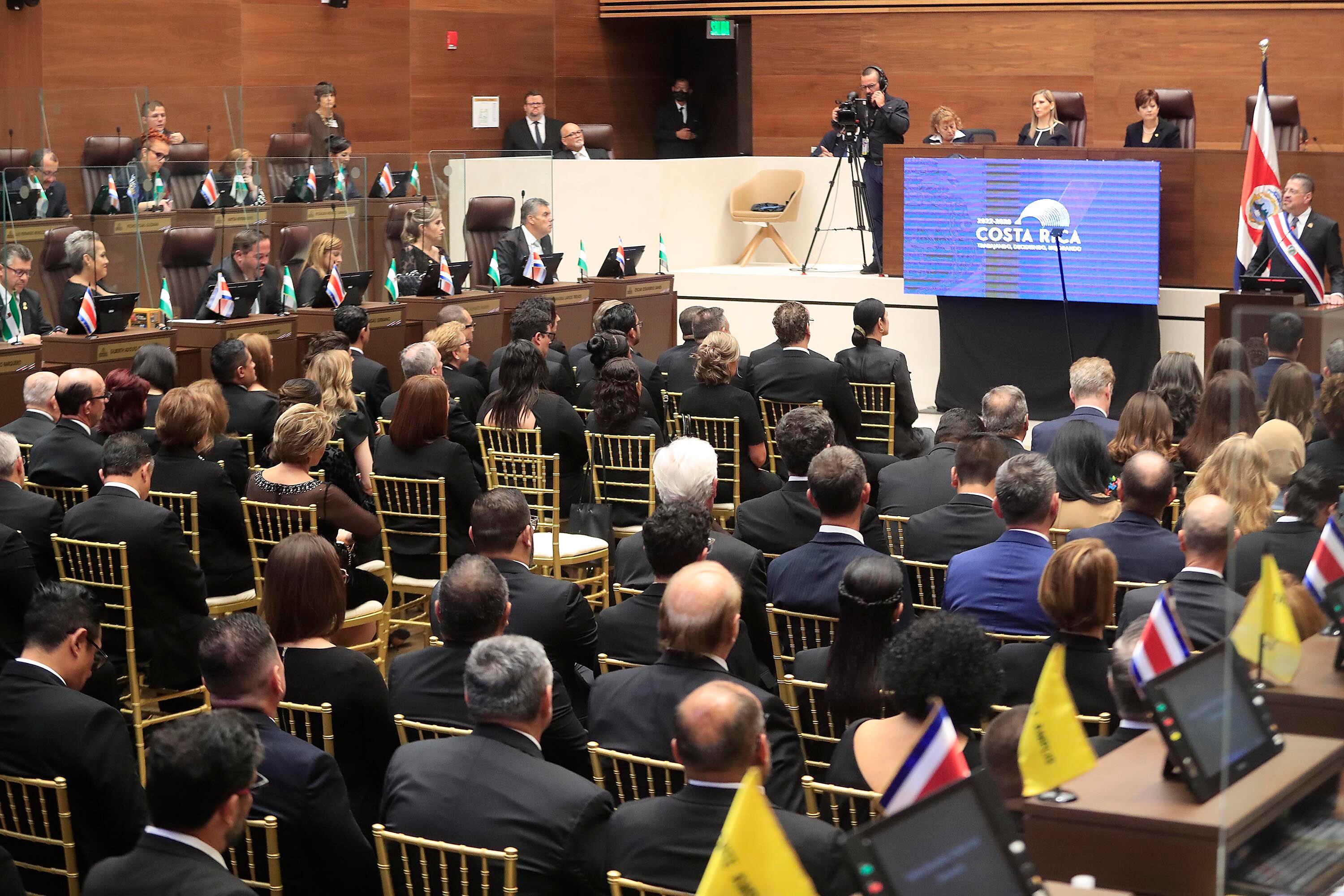 La actividad oficial arrancó a las 2 p.m. en la sede central del Instituto Nacional de Seguros (INS), el presidente salió de ahí con la cinta presidencial bien puesta, en compañía de su equipo de gobierno y caminó hasta la Asamblea Legislativa para dar el discurso.