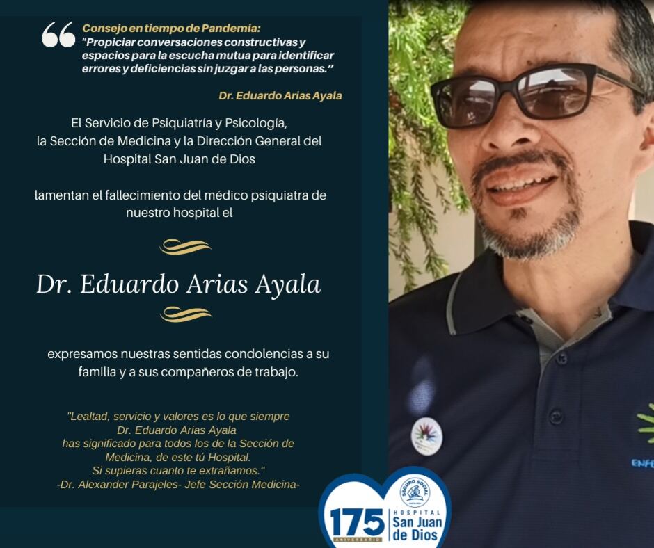 “El doctor Arias fue un gran ser humano, esposo, padre, profesional del más alto nivel; un siquiatra que atendió siempre con amor a sus pacientes, y si bien su muerte nos causa un inmenso dolor y tristeza su memoria estará siempre viva como un recordatorio de la gran labor que hace la Caja por la salud de los costarricenses en medio de esta intensa pandemia por covid-19” dijo el doctor Mario Ruiz, gerente médico de la Caja.