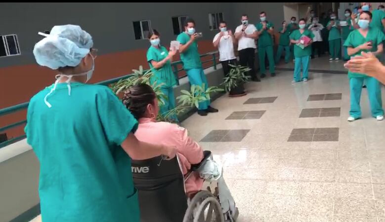 A la enfermera, con 16 años de experiencia y vecina de Turrubares, la sacaron en una silla de ruedas por uno de los pasillos del hospi y alrededor de ella había una fila de profesionales aplaudiéndole, como lo merece. ¡Es una campeona!