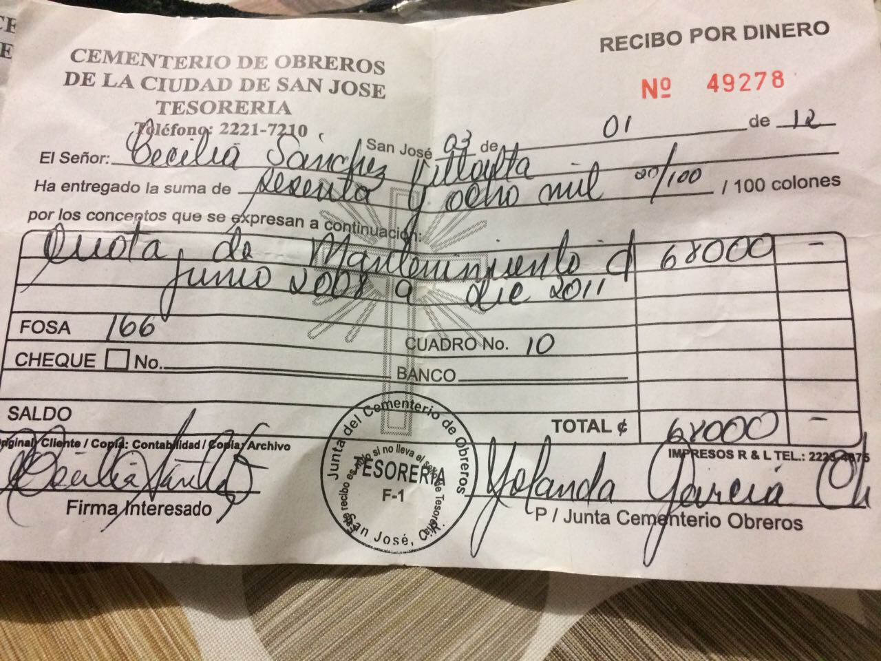 "Cada vez que llamaba me decían que la encargada seguía fuera de San José, lo que me empezó a sonar mal, pues ¿qué tanto tiene que hacer una empleada de un cementerio por todo el país por casi un mes? Fui a las oficinas y me atendió una Yolanda (García), quien me dijo que en cuanto tuvieran el libro, me informaban", contó Rojas.