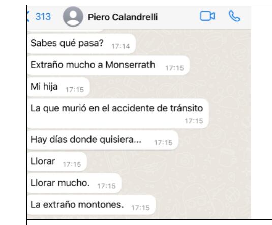 “Es duro. Ahora en el BCR había una niña muy parecida a Monse, por un momento creí que ese mae (Dios) por fin servía de algo y me la había devuelto unos segundos para abrazarla. Pero no, era otra niña, cosas que duelen. Pucha... yo era su papá, pero no te preocupes cariño, estaré bien... aunque ahorita solo desee dormir”, se lee en otra de las conversaciones entre Vargas y Chacón.