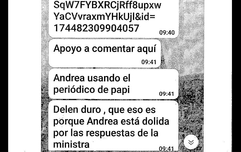 “Andrea usando el periódico de papi. Delen duro que eso es porque Andrea está dolida por la respuesta de la ministra”, se lee en uno de los mensajes.