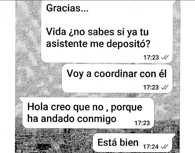 Alberto también envió comprobantes de los depósitos que le hacía Chacón por medio de su chofer, Richard Gutiérrez, incluso hay mensajes en lo que el trol le pregunta a Chacón si ya el asistente le hizo un pago acordado y ella le dice que cree que no porque ha andado con ella todo el día.