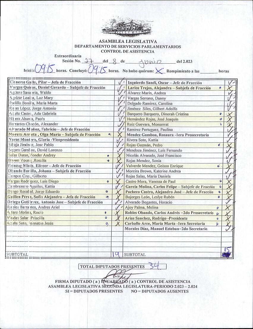 Ni siquiera el presidente legislativo, Rodrigo Arias, llegó este jueves a tiempo, según se supo él era uno de los que tenía una cita médica. Como Arias no estaba quien tomó el control del Plenario fue la vicepresidenta, Gloria Navas, quien a las puras 9:15 a. m. pidió que se cerraran las puertas y pidió a Manuel Morales, segundo secretario del directorio, que tomara lista, así como la pasan en la escuela al inicio de las lecciones.