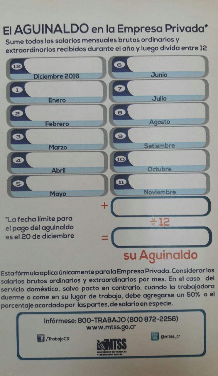 Por ejemplo, si una persona ganó ¢350.000 por mes entre el 1 de diciembre del 2017 y el 30 de noviembre del 2018, debe sumar todos esos doce meses de salario (digamos que no metió ni una sola hora extra), esa suma le da 4.200.000 y eso debe dividirlo entre 12, lo que da 350.000, esa es la cantidad de dinero que le toca de aguinaldo ¢350.000.