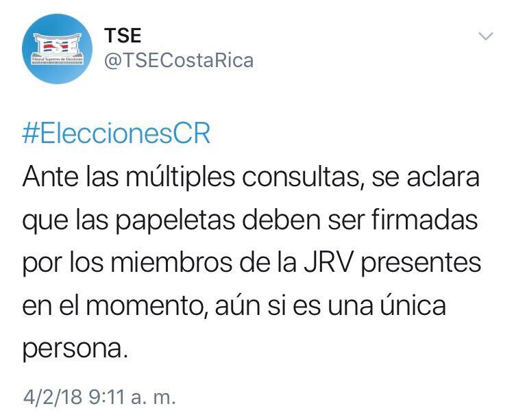 El Tribunal Supremo de Elecciones (TSE) tuvo que aclarar que las papeletas pueden estar firmadas por los miembros de las juntas receptoras de votos que estén presentes en el momento en que el ciudadano llena a votar, aún si solo hay un miembro de mesa.