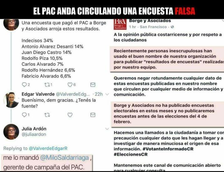 En ese mismo perfil ella indicó que la información fue brindada por Camilo Saldarriaga, gerente de campaña del PAC. Dichos tuits fueron eliminados.