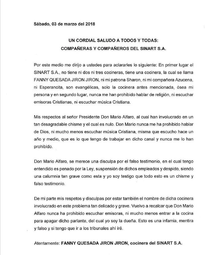 Por su parte, Fanny Quesada, una de las cocineras, confirmó en una carta dirigida al personal del Sinart que la acusación es falsa.