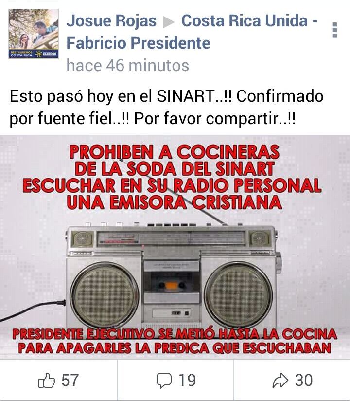 El presidente ejecutivo del Sistema Nacional de Radio y Televisión (Sinart), Mario Alfaro, desmintió una publicación compartida en el grupo de Facebook Costa Rica unida - Fabricio presidente en que se afirma que se le prohibió a las cocineras de la soda del canal escuchar una emisora cristiana.