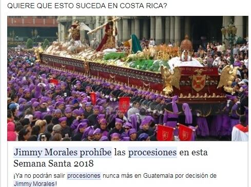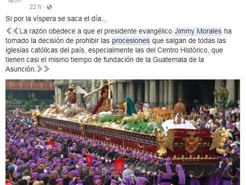 Una noticia falsa que relata cómo el presidente de Guatemala, Jimmy Morales, prohibió las procesiones de Semana Santa de este 2018 se está viralizando en redes sociales.