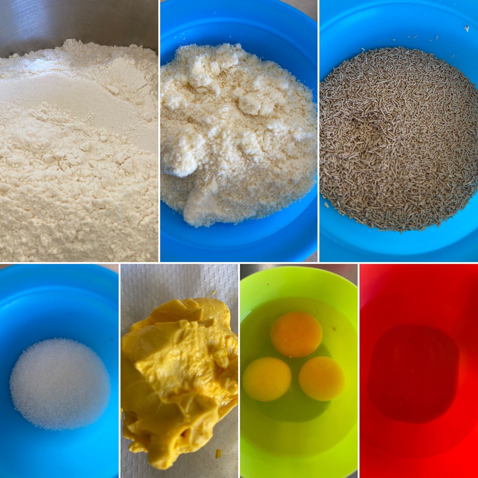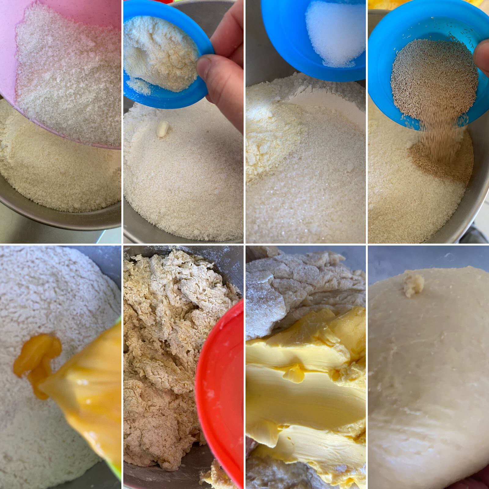 Una vez tenemos los secos agregamos los huevos batidos, el agua y hacemos una sola masa, colocamos la grasa de forma untada y seguimos amasando hasta que sea una masa lisa y fina, llevamos a reposar por unos 30 minutos.