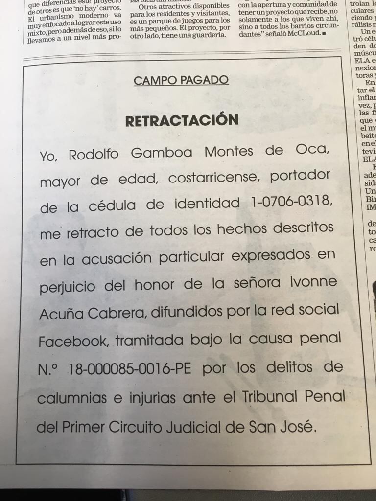“Yo, Rodolfo Gamboa Montes de Oca, mayor de edad, costarricense, portador de la cédula de identidad 1-0706-0318, me retracto de todos los hechos descritos en la acusación particular expresados en perjuicio del honor de la señora Ivonne Acuña Cabrera, difundidos por la red social Facebook, tramitada bajo la causa penal N° 18-000085-0016-PE por los delitos de calumnias e injurias ante el Tribunal Penal del Primer Circuito Judicial de San José”.