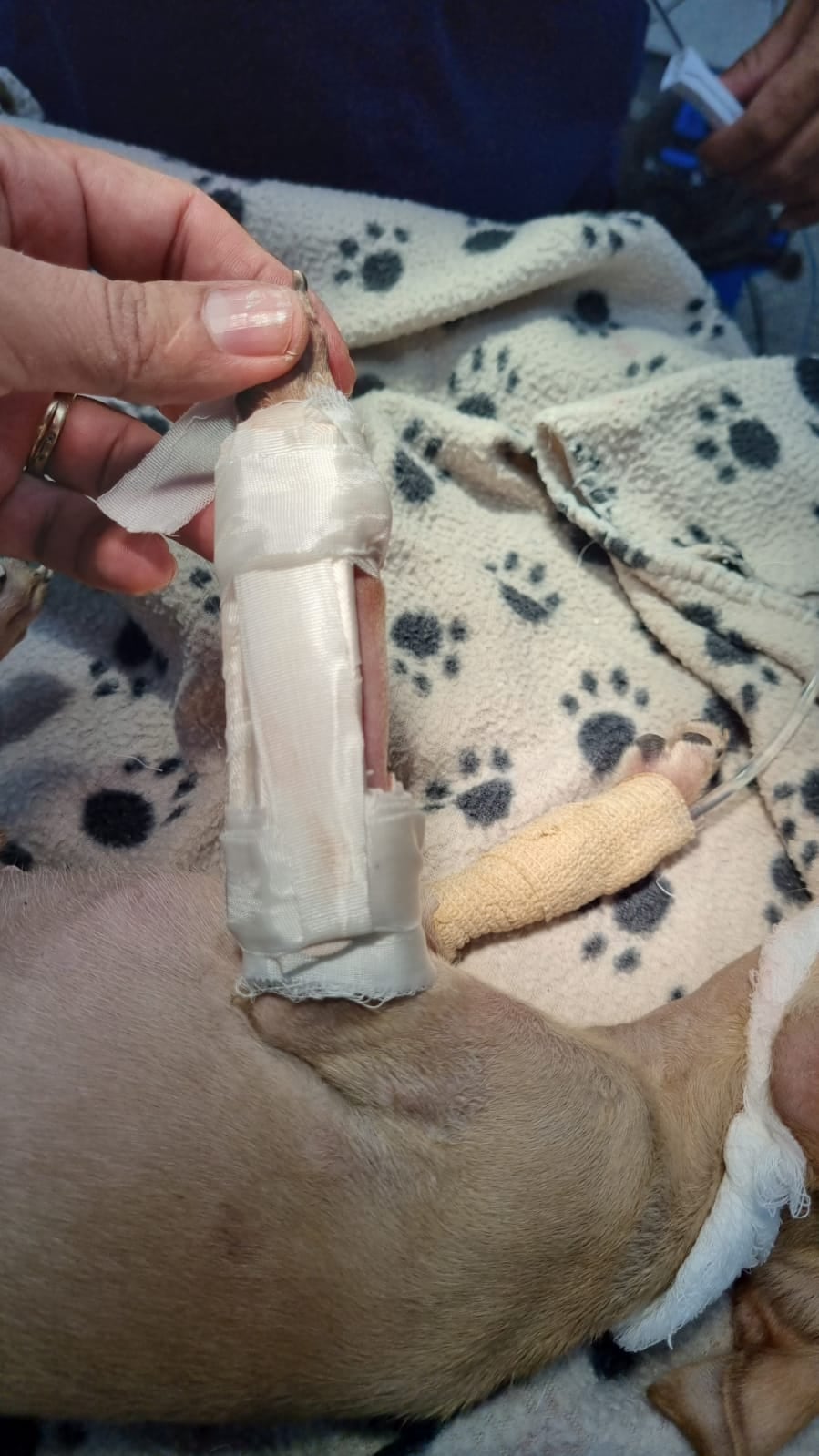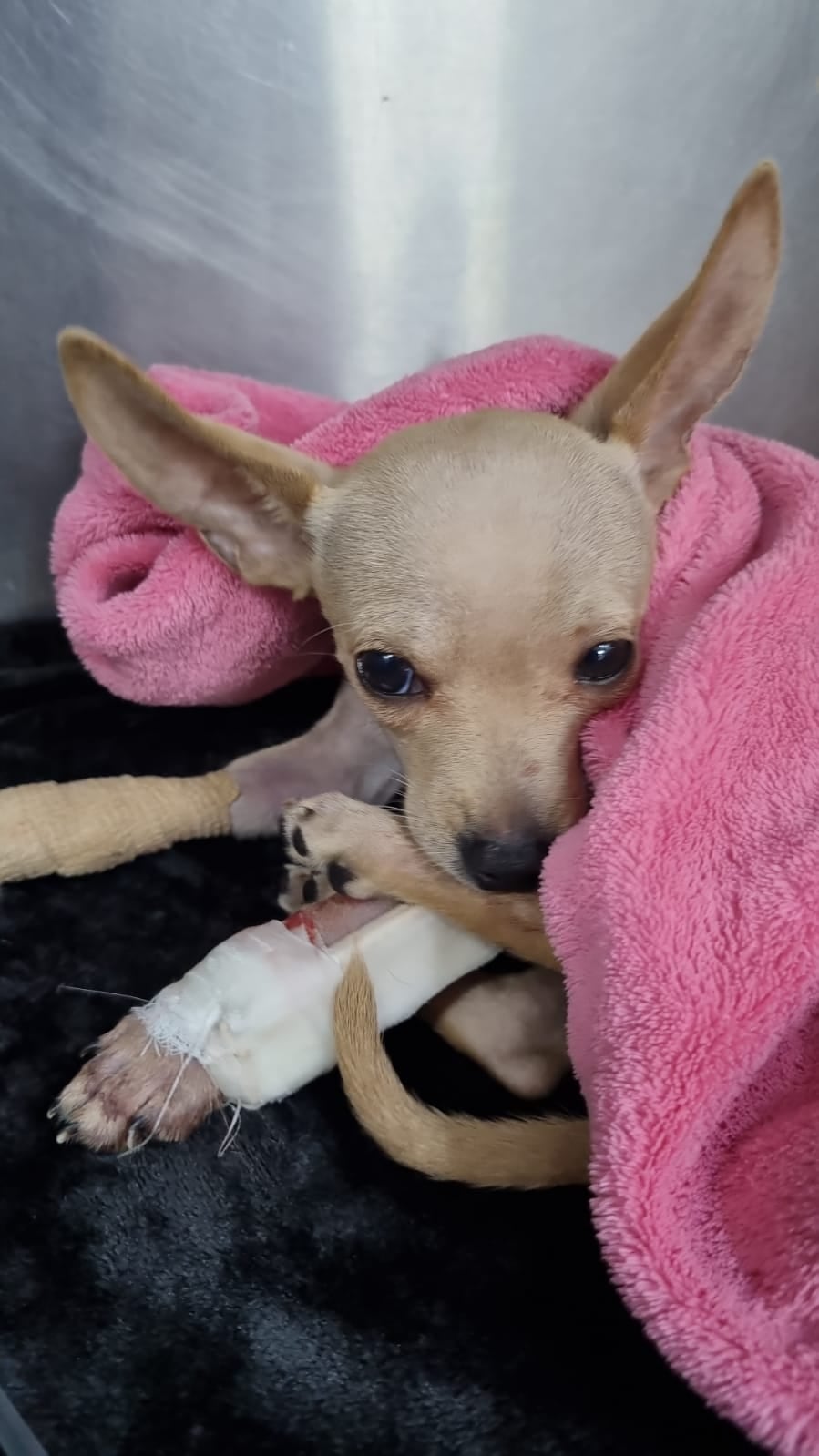 La primera operación fue el 19 de abril, en ella le pusieron una platina para reconstruirle la patita al pequeño chihuahua y fue bastante complicada, porque el animalito está muy pequeño, tanto en tamaño como en edad.