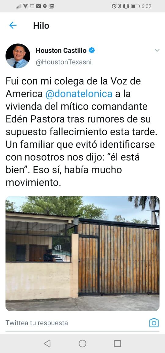 Fui con mi colega de la Voz de America @donatelonica a la vivienda del mítico comandante Edén Pastora tras rumores de su supuesto fallecimiento esta tarde. Un familiar que evitó identificarse con nosotros nos dijo: “él está bien”. Eso sí, había mucho movimiento. pic.twitter.com/j3cKrwLd4W