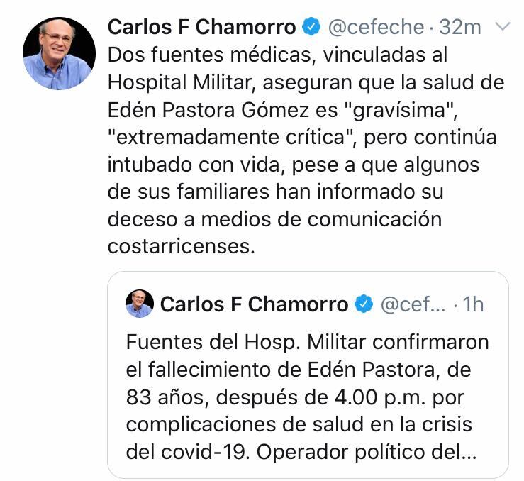 Sin embargo, a eso de las 6 p.m., Chamorro se desdijo, y publicó el siguiente tuit: "Dos fuentes médicas vinculadas al Hospital Militar, aseguran que la salud de Edén Pastora es “gravísima”, “extremadamente crítica, pero que continúa entubado con vida”.