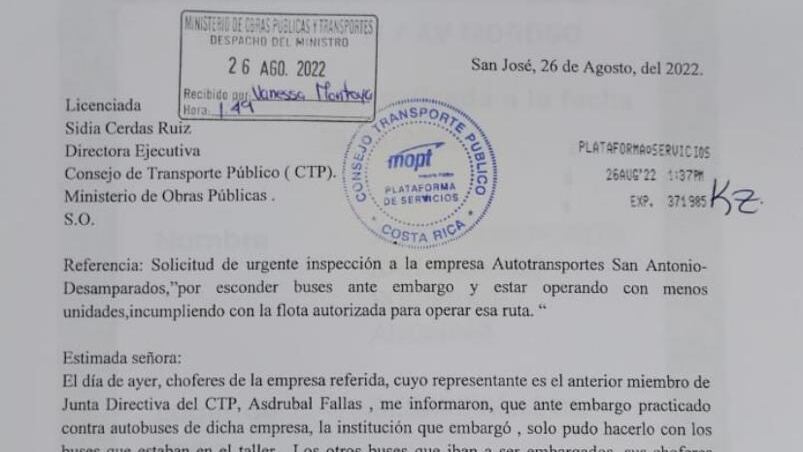 La carta dirigida a Sidia Cerdas Ruiz, directora ejecutiva del CTP y con copia al ministro de Obras Públicas y Transportes, Luis Amador; Laura Ulloa, viceministra de Transportes y a la Defensoría de los Habitantes indica que la solicitud es “por esconder buses ante embargo y estar operando con menos unidades, incumpliendo con la flota autorizada para operar esa ruta”.