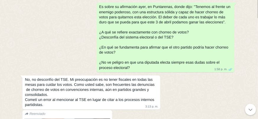 Un día después, el domingo, La Nación le preguntó si desconfiaba del TSE o del sistema electoral y en qué se fundamenta para decir que su rival podría incurrir en un chorreo de votos. Respondió por Whatsapp un comentario que dice: