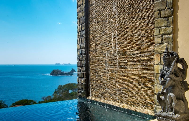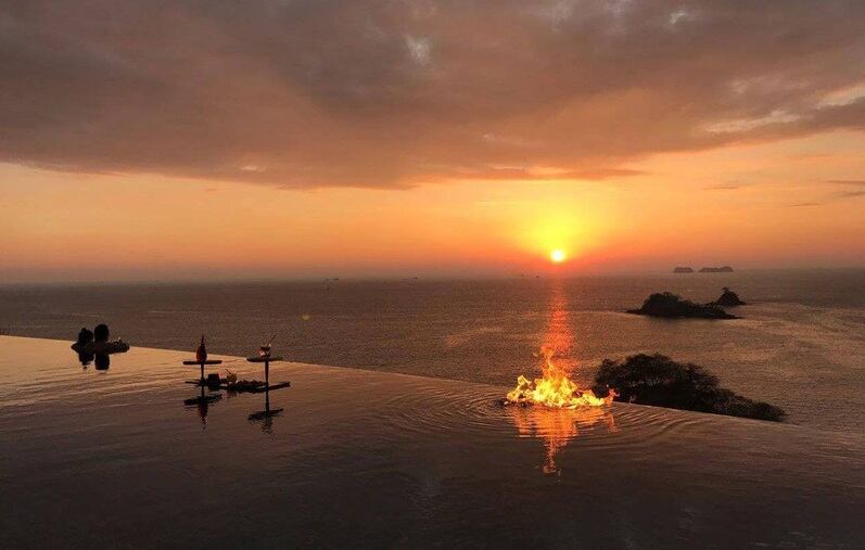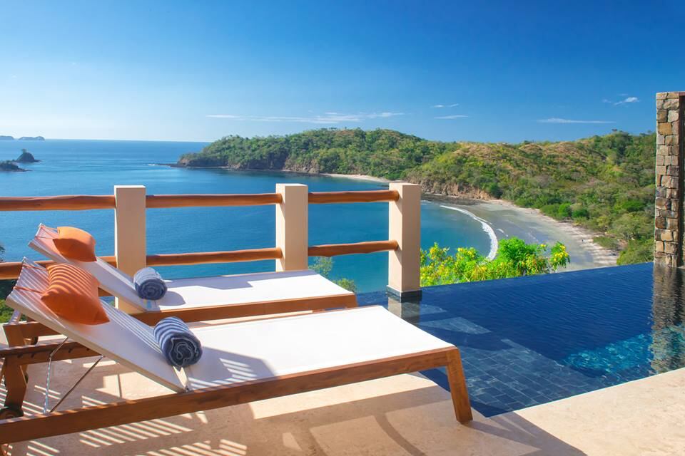 “Un complejo de adultos en la cima de una colina en Costa Rica, con una piscina de borde infinito y con vistas al Océano Pacífico y bosque tropical seco. Después de hacer senderismo, ciclismo, kayak o disfrutar de la playa, no hay mejor maneras para refrescarse mientras se disfruta de las puestas de sol, que son particularmente espectaculares”.