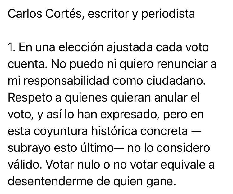 El periodista y escritor costarricense Carlos Cortés escribió un texto en el cual fijó su posición de cara al domingo: “en una elección ajustada cada voto cuenta. No puedo ni quiero renunciar a mi responsabilidad como ciudadano. Respeto a quienes quieran anular el voto, y así lo han expresado, pero en esta coyuntura histórica concreta —subrayo esto último— no lo considero válido. Votar nulo o no votar equivale a desentenderme de quién gane”.