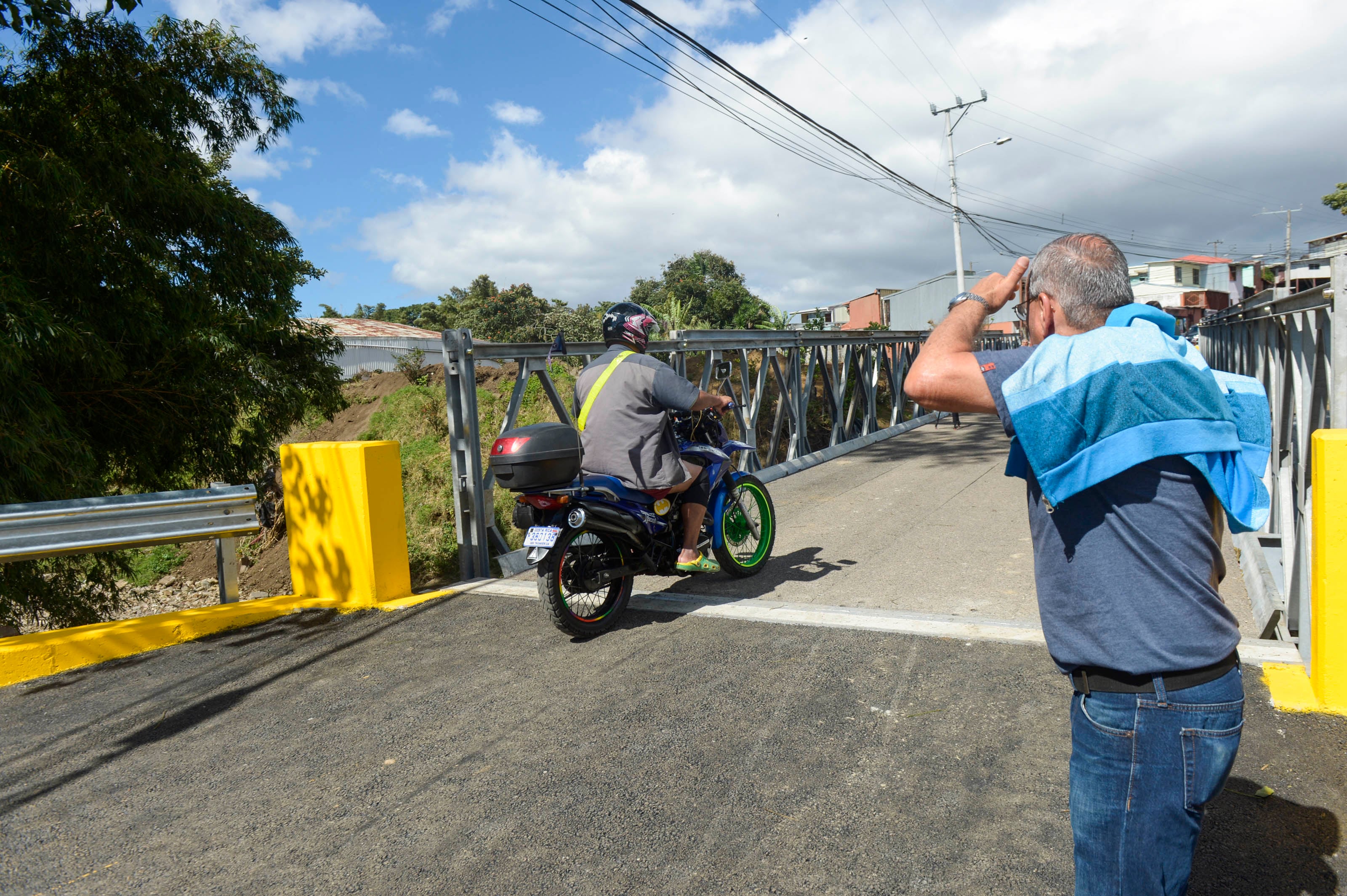 No se había ni terminado de habilitar el paso cuando el motociclista Carlos Tellez fue el primero en estrenar el puente, seguido por unos trabajadores de Cable Tica, un camioncito, dos carros particulares y otro motociclista, dejando en evidencia la falta que hacía.