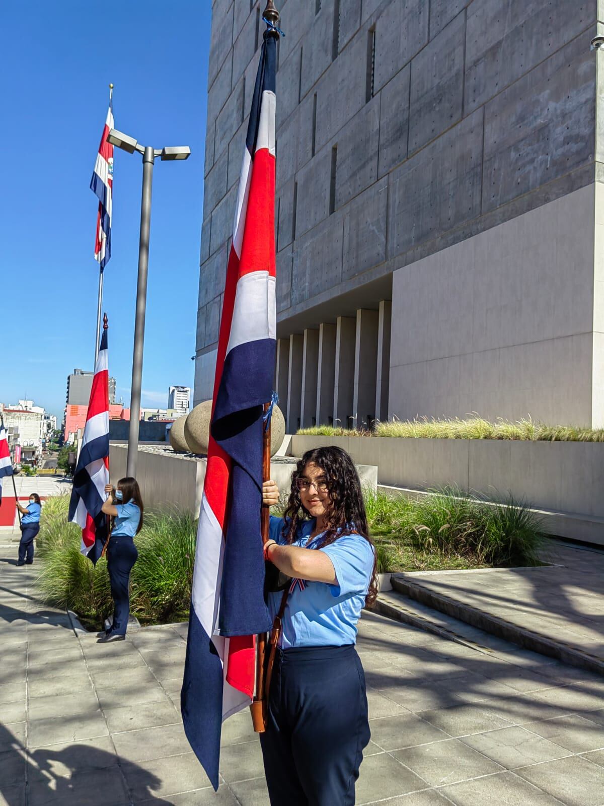 Con una bandera de Costa Rica y una enorme sonrisa recibe a los invitados que llegan al edicio nuevo de la Asamblea Legislativa.