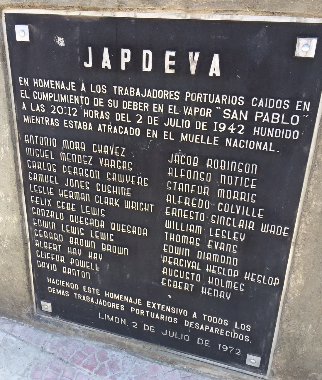 El pieza de metal tiene escritos los nombres de los fallecidos y a la par una leyenda que dice: “En homenaje a los trabajadores portuarios caídos en el cumplimiento de su deber en el vapor ‘San Pablo’”.