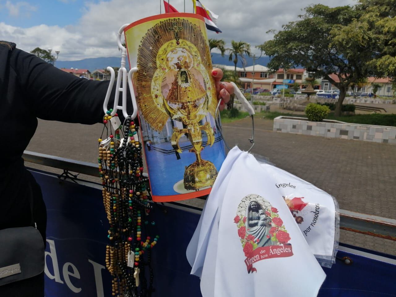 Lorena Loaiza alistó hace ocho días unos pañuelitos con la imagen de la virgen de Los Ángeles para venderle a los romeros, pero dice que el negocio ha estado malísimo.