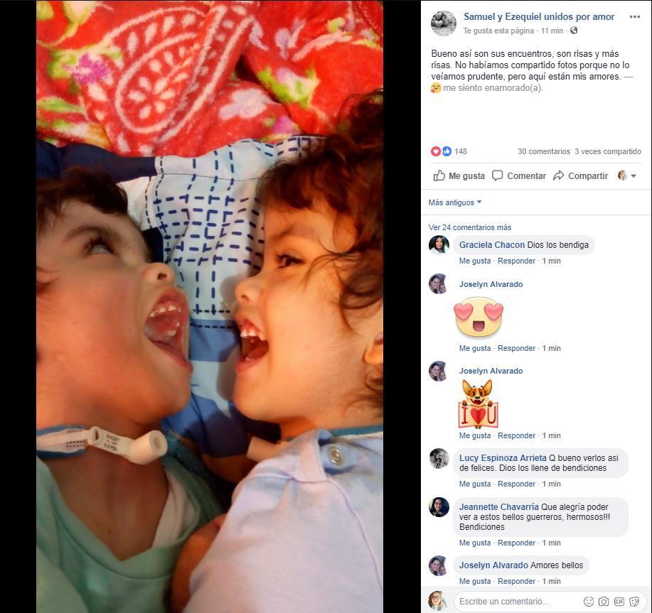 Una imagen conmovedora alegró a muchos la mañana de este viernes cuando se toparon en Facebook con una foto que compartió Evelyn Badilla, madre de los exsiameses Samuel y Ezequiel, en la que salen los chiquitos sonriendo y viéndose de frente.