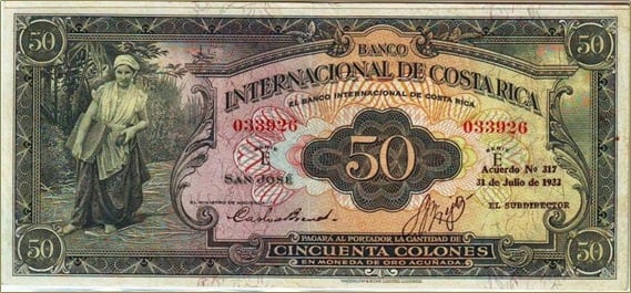 Los primeros billetes con sello tico se crearon en 1858, durante el gobierno de Juan Rafael Mora Porras, quien creó el primer Banco Nacional de Costa Rica, pero nada que ver con el que conocemos hoy en día. Ese era privado, propiedad de Crisanto Medina, un argentino, pero por las malas inversiones, cerró al año.
