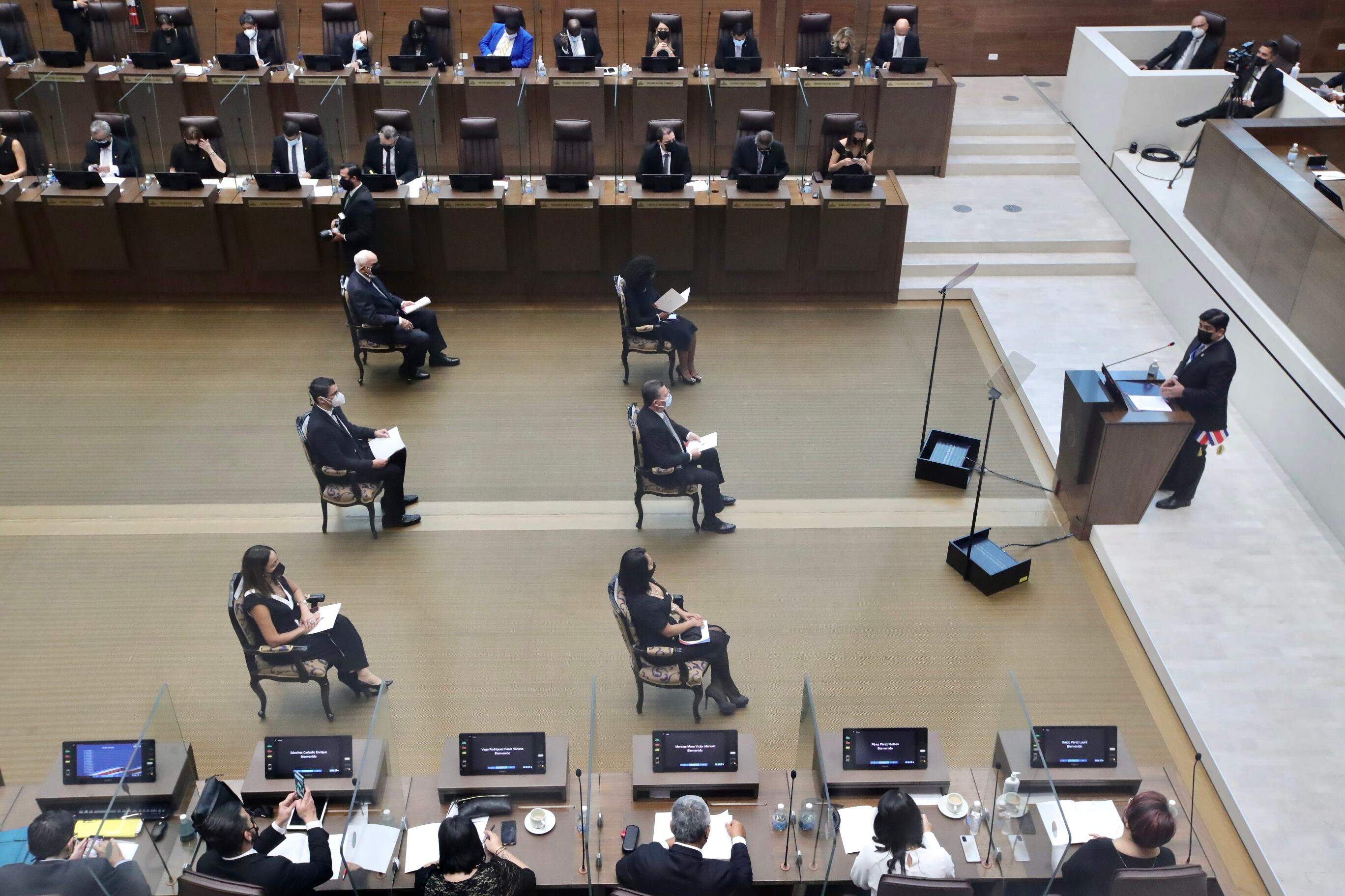 Los encargados de Protocolo resolvieron el tema así: solicitaron a los miembros del nuevo Directorio voltearse y a Cruickshank bajar al plenario para juramentarlos allí. Y de fondo quedó la mesa del Directorio.